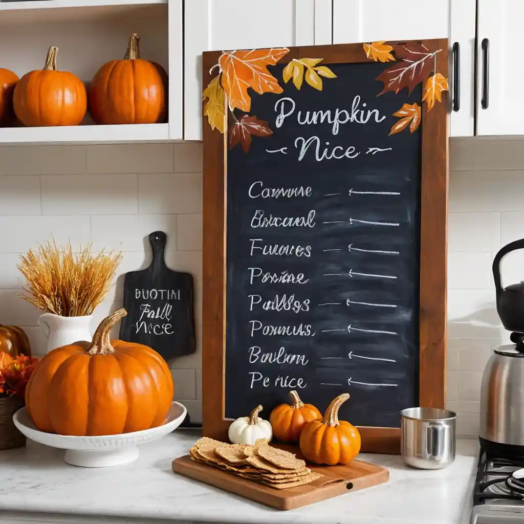 Hang a chalkboard and write fall-themed menus or quotes like “Pumpkin Spice & Everything Nice.” It’s both practical and decorative.