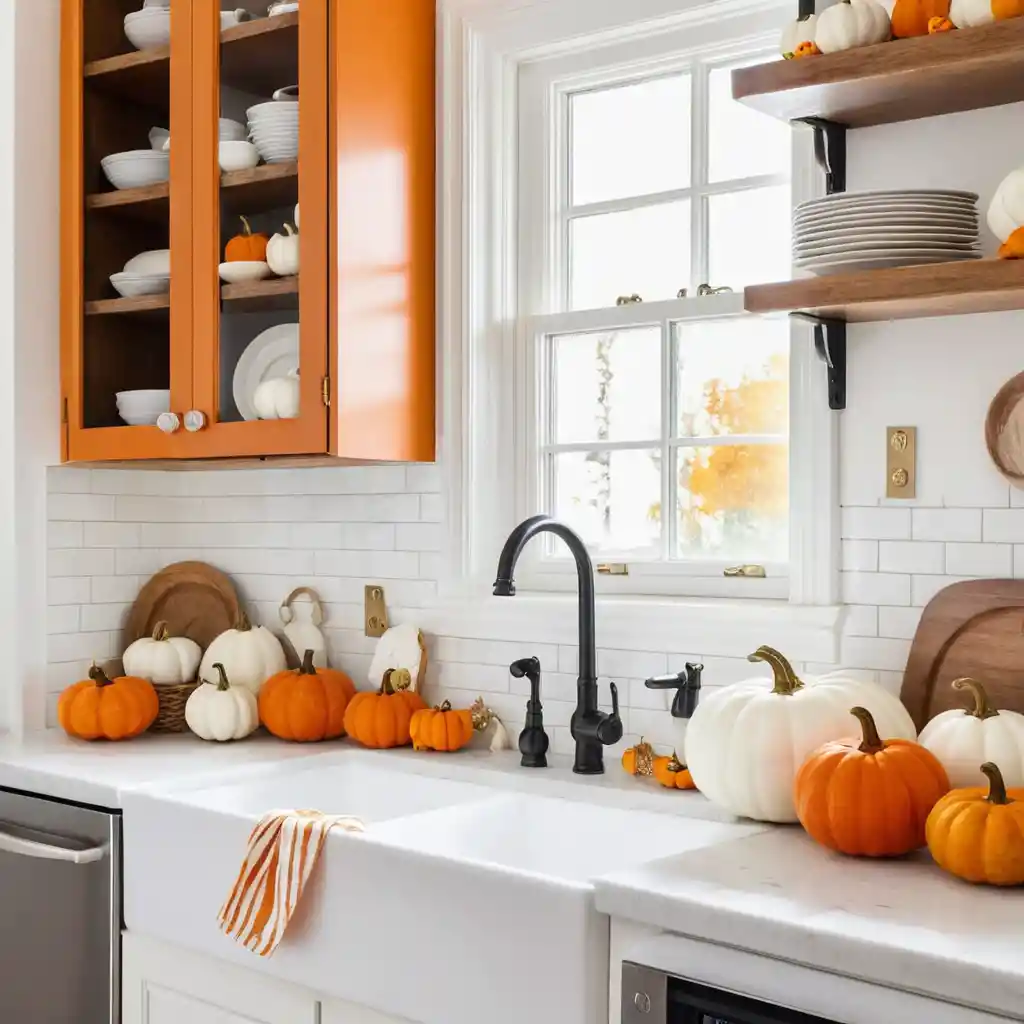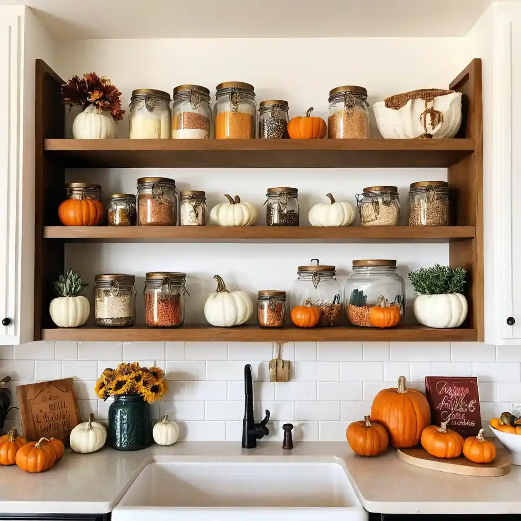 Fill open shelves with seasonal cookbooks, jars of spices, and autumn-themed ceramics for a curated seasonal look.