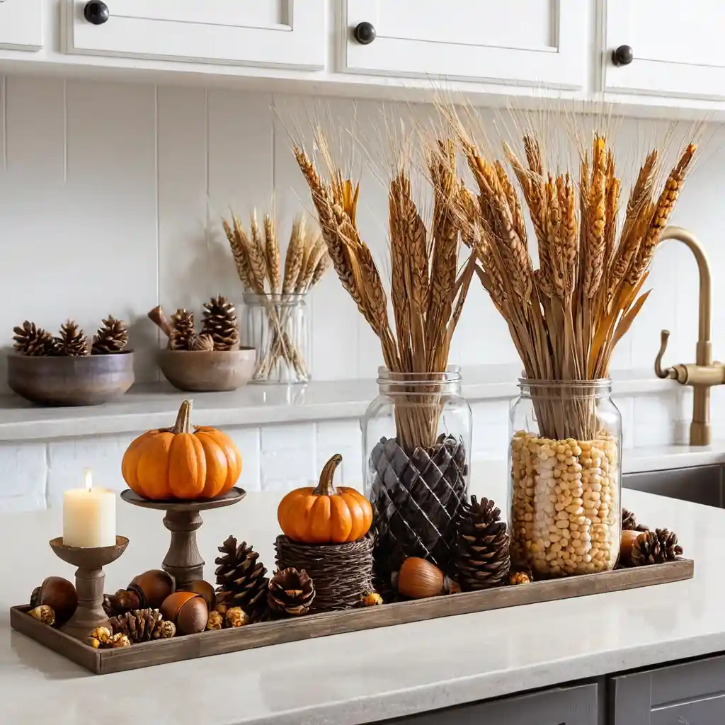 Bring in acorns, pinecones, dried corn, and wheat stalks for a nature-inspired fall kitchen display.