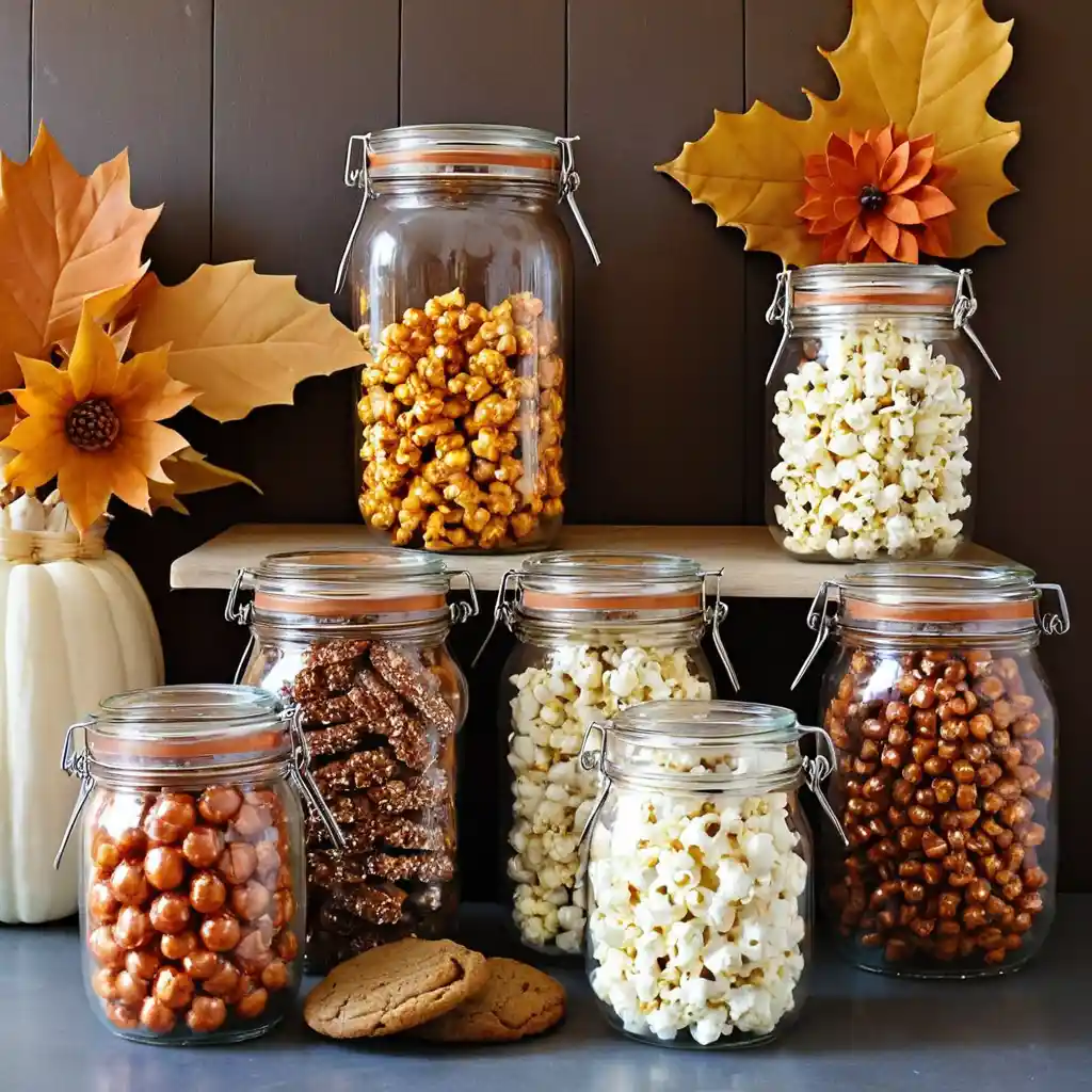 Fill glass jars with cookies, pumpkin bread, or caramel popcorn. They look festive and delicious, perfect for autumn gatherings.