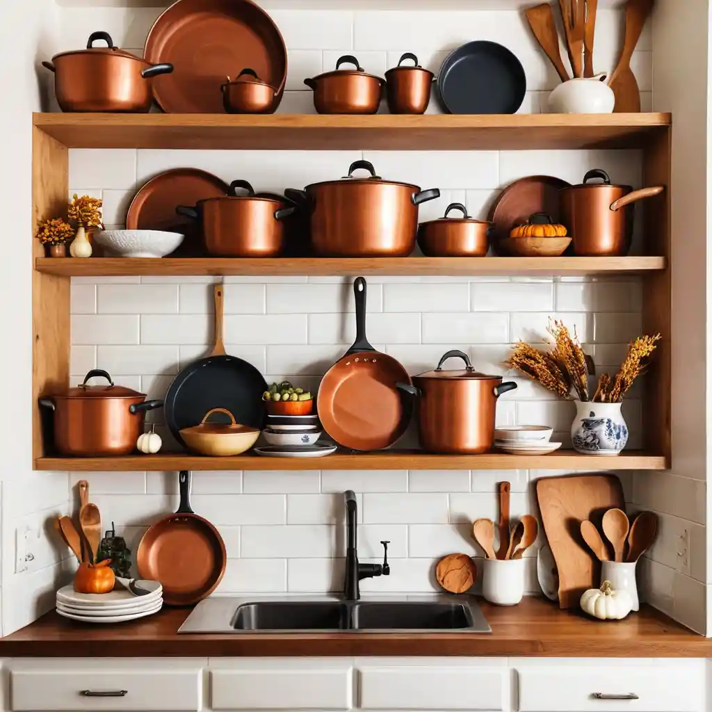 Show off copper pots, ceramic baking dishes, and wooden utensils on open shelves. These not only look beautiful but also capture that fall warmth.