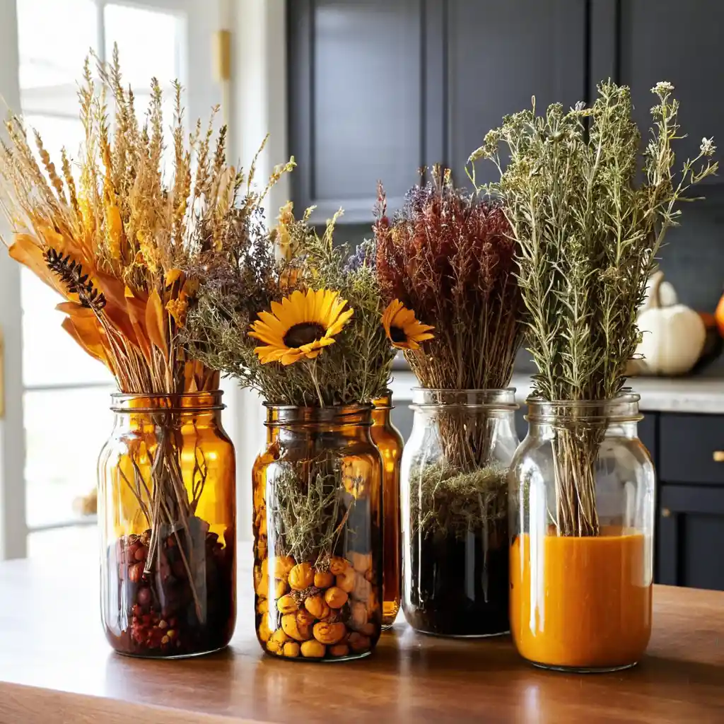 Fill amber glass bottles with dried herbs or flowers. Their rich color reflects the warm glow of fall sunlight beautifully.