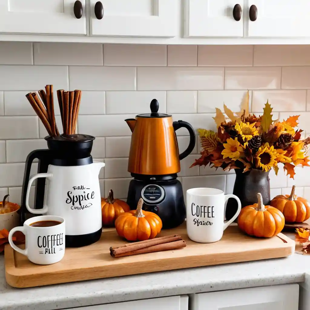 Create a small coffee corner with seasonal mugs, pumpkin spice syrup, and cinnamon sticks. It’s a functional yet decorative fall feature.
