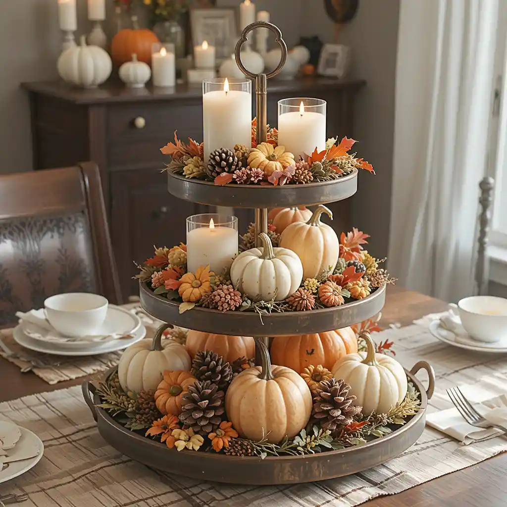 Use a tiered tray filled with gourds, candles, pinecones, and small florals as a centerpiece. This layered design creates visual interest while saving space on the table.