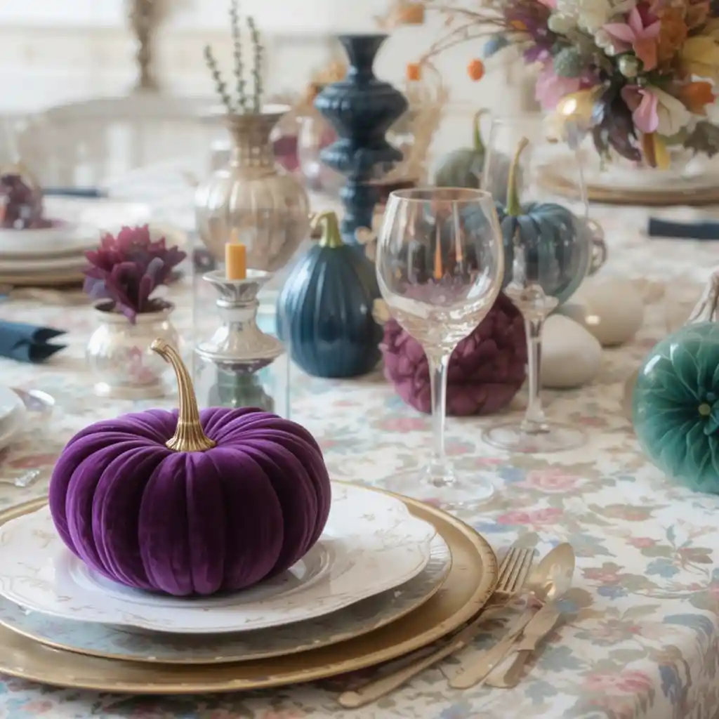 Decorate with velvet pumpkins in jewel tones like emerald, plum, and navy. They add texture and elegance, giving your table a luxurious Thanksgiving vibe.