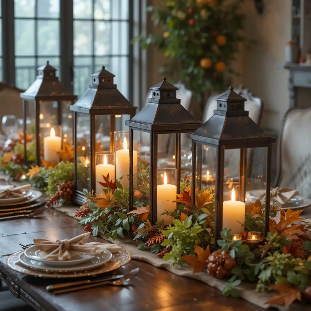 Place lanterns filled with candles and greenery down the center of your table. This rustic-meets-modern style creates a cozy and welcoming glow for your dinner.