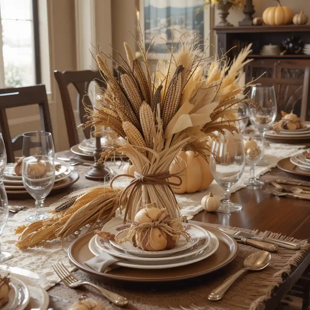 Incorporate corn husks or dried corn bundles tied with ribbon into your table design. These classic harvest symbols bring authenticity to your Thanksgiving theme.