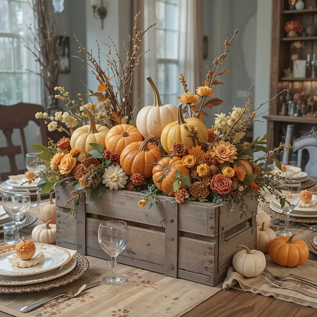 Repurpose a wooden crate filled with pumpkins, gourds, and florals as a bold centerpiece. It adds height and a rustic farmhouse touch that’s perfect for Thanksgiving dinner.