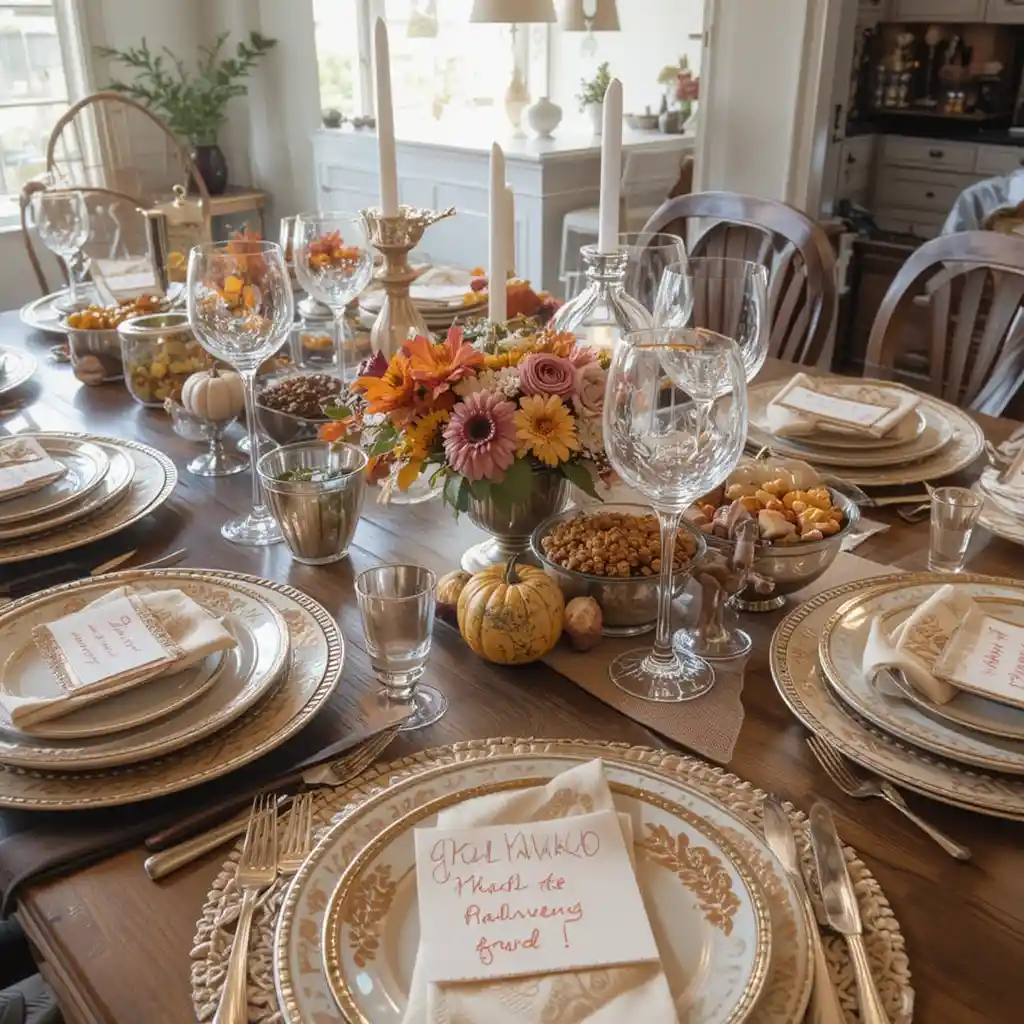 Place gratitude cards at each plate where guests can write what they’re thankful for. It’s both decor and a meaningful tradition that makes the holiday special.