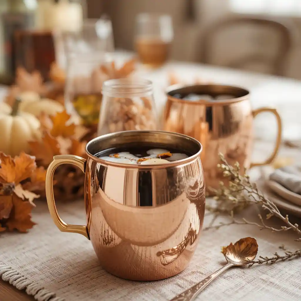 Swap regular glasses for copper mugs to serve cider or cocktails. They bring a rustic shine and fit beautifully with warm-toned Thanksgiving table decor.
