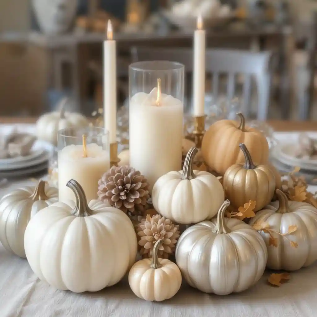 Arrange different-sized pumpkins in neutral or metallic tones as a centerpiece. Mixing mini pumpkins with candles adds a festive charm while keeping the table warm and inviting.