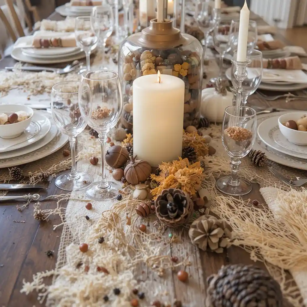 Scatter acorns, pinecones, and small seasonal elements across the table for a natural finishing touch. It’s simple, inexpensive, and ties the whole theme together.