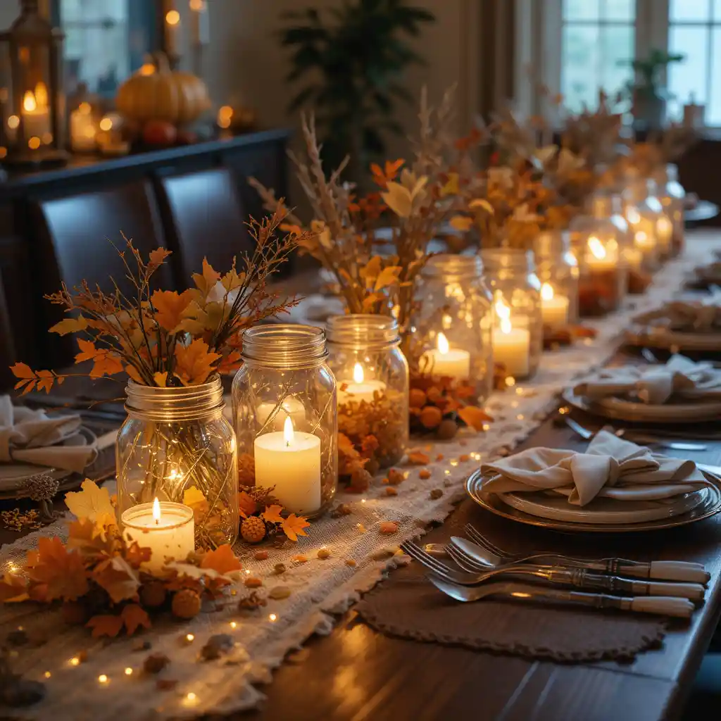Fill mason jars with tea lights or fairy lights to create a soft glow across your table. This affordable decor idea adds warmth and coziness while highlighting the fall atmosphere.
