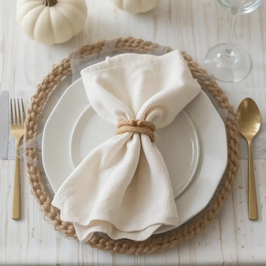 Elevate your table setting with linen napkins in cream or beige, secured with decorative napkin rings made of wood, gold, or even braided rope. This adds elegance without overwhelming the design.