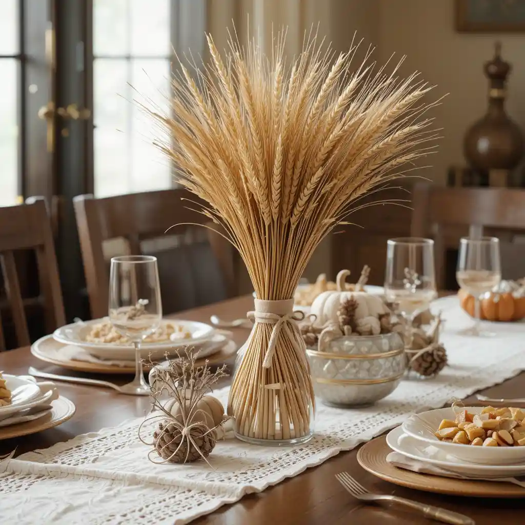 Place bundled stalks of wheat tied with ribbon in the center of your table. This timeless decoration symbolizes abundance and pairs beautifully with rustic Thanksgiving decor.