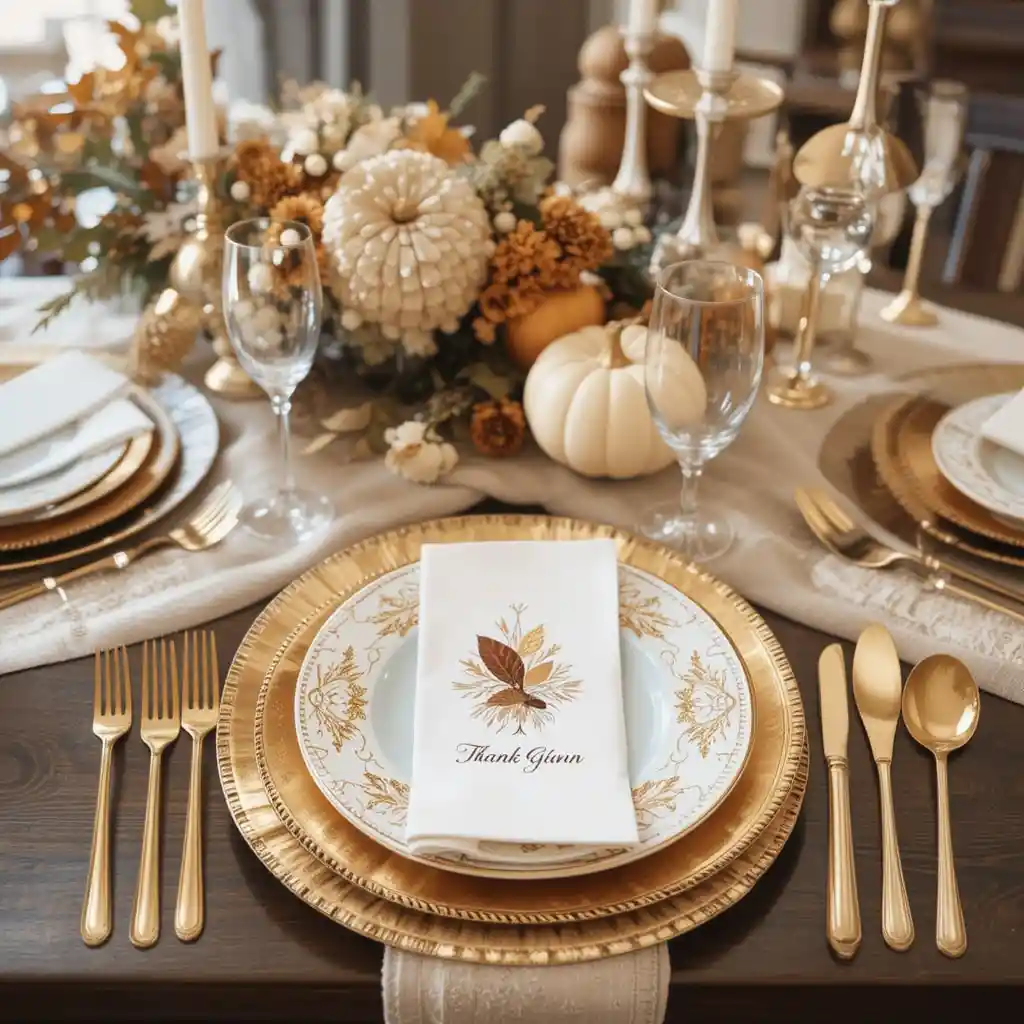 Upgrade your dinnerware with gold flatware and metallic touches. These small details instantly make your Thanksgiving table look chic and sophisticated.