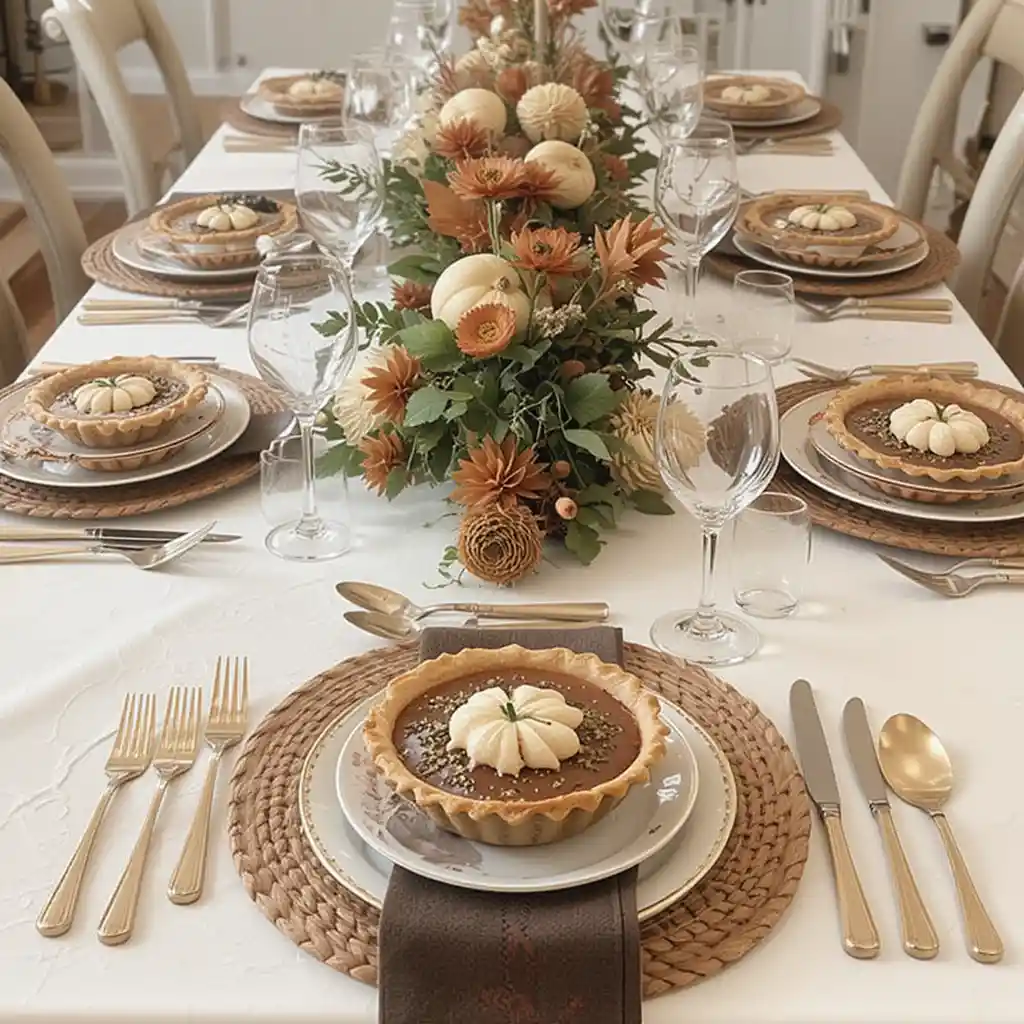 Delight your guests with mini pies placed at each setting as both decor and dessert. It’s a creative way to combine treats with festive table styling.