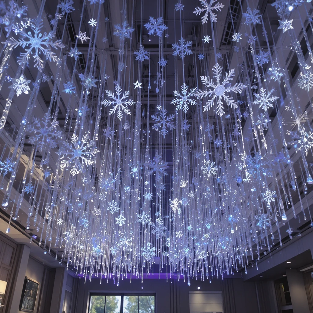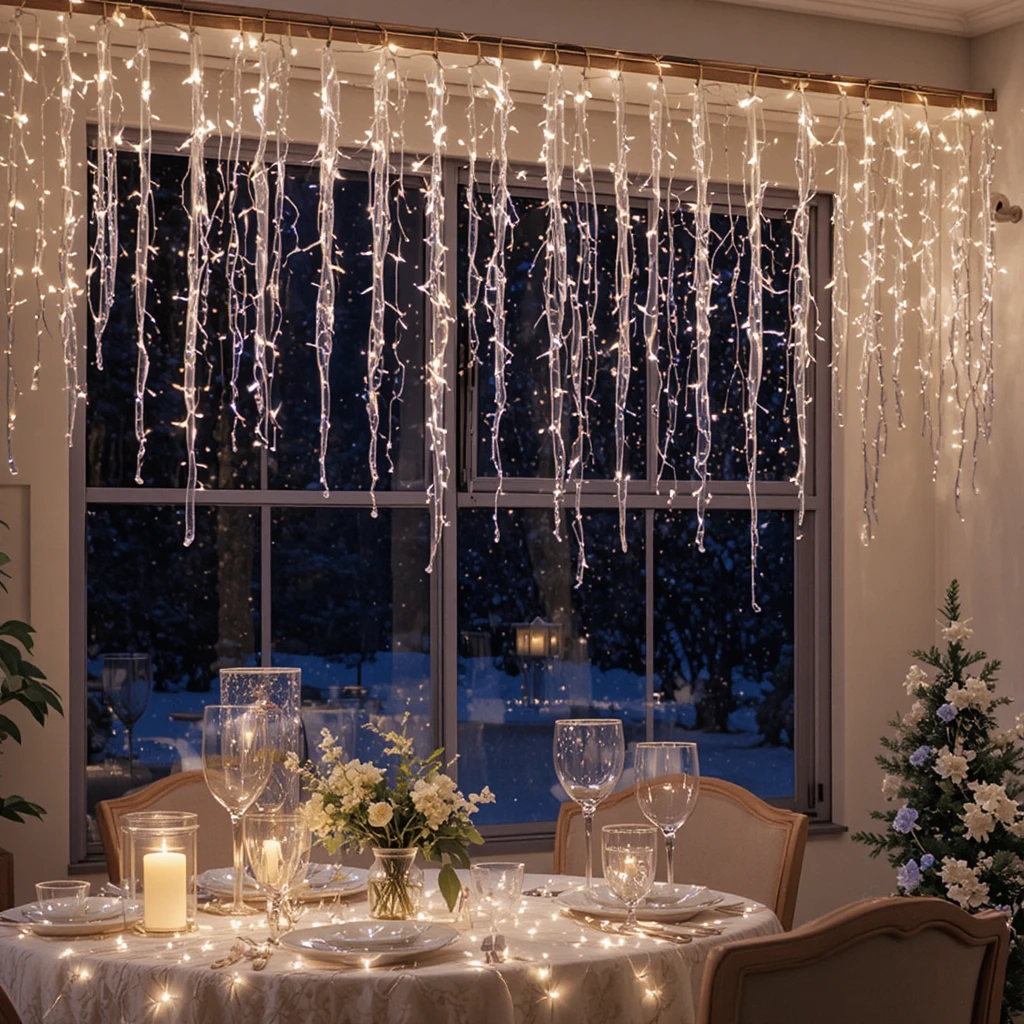 Hang cascading icicle lights across walls, ceilings, or windows. Their twinkling effect creates instant winter magic and fills the space with radiance.