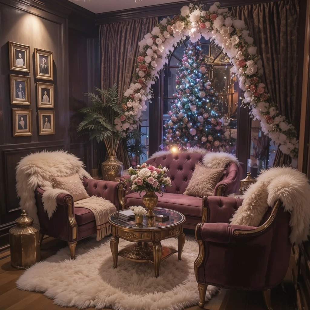 Set up cozy seating with velvet chairs, faux fur throws, and sparkling cushions. This chic corner adds a warm, inviting touch to your winter homecoming decoration.