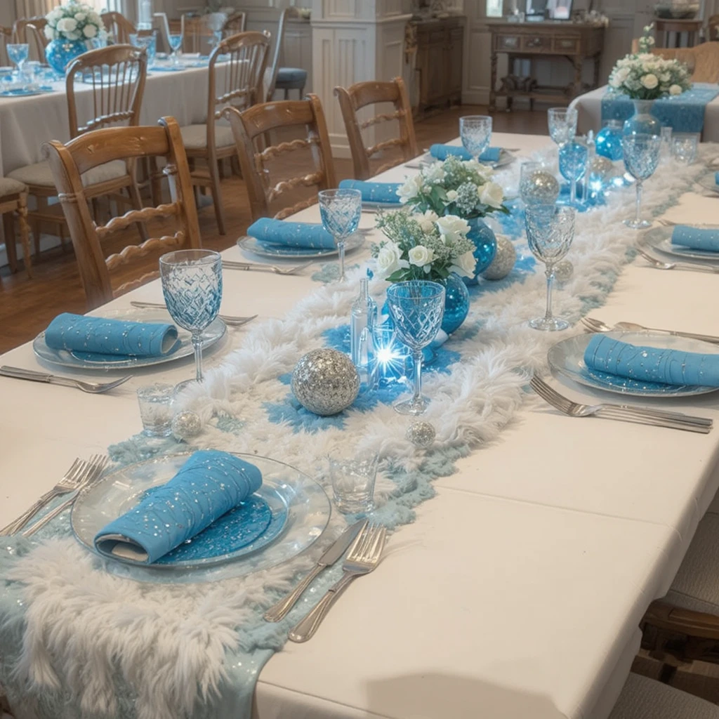 Use white faux fur or glittery fabric as table runners. Paired with silver or blue tableware, they deliver both texture and sparkle.