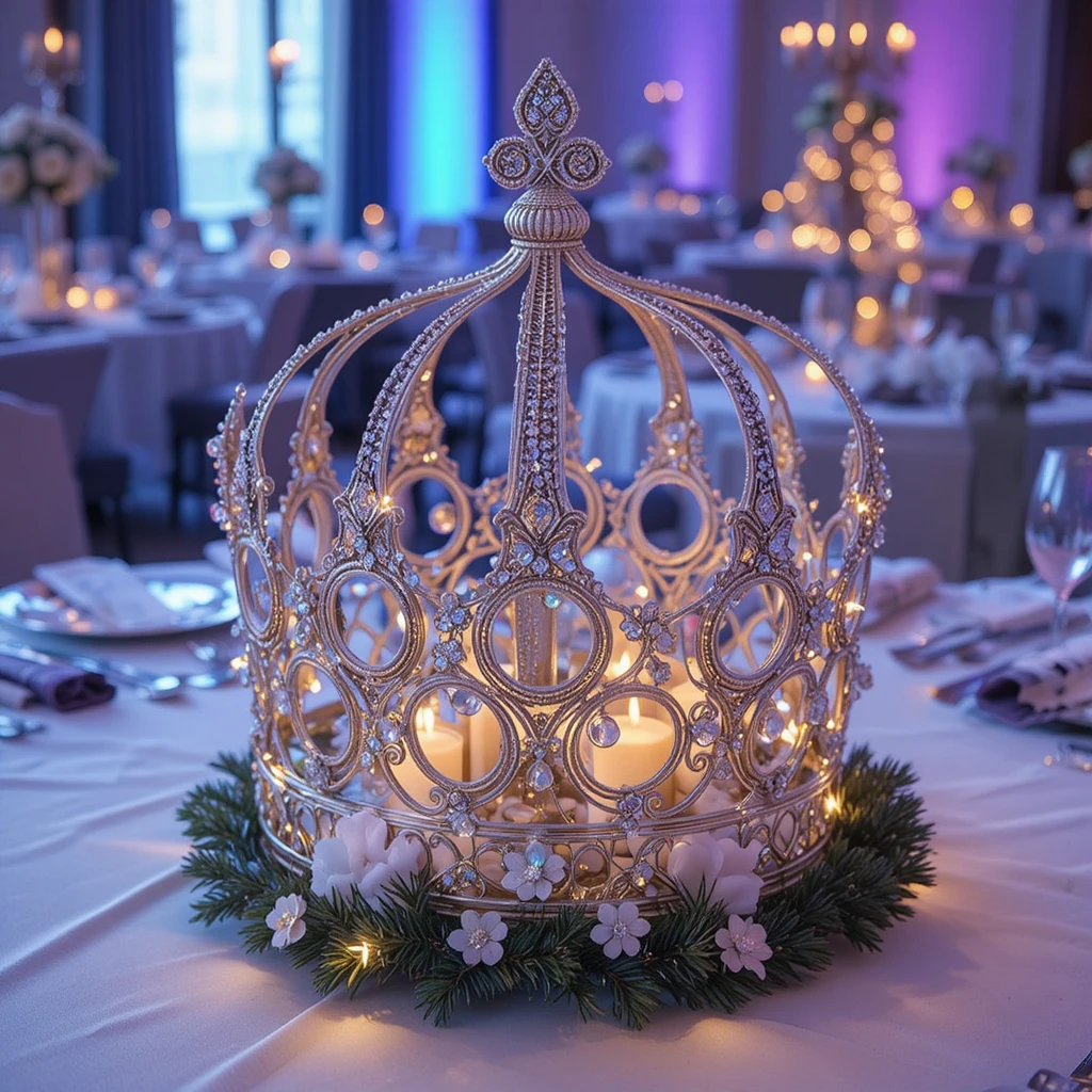 Adorn tables with metallic crowns decorated with crystals, pine sprigs, and mini lights. This regal touch adds elegance to your overall winter homecoming decoration.