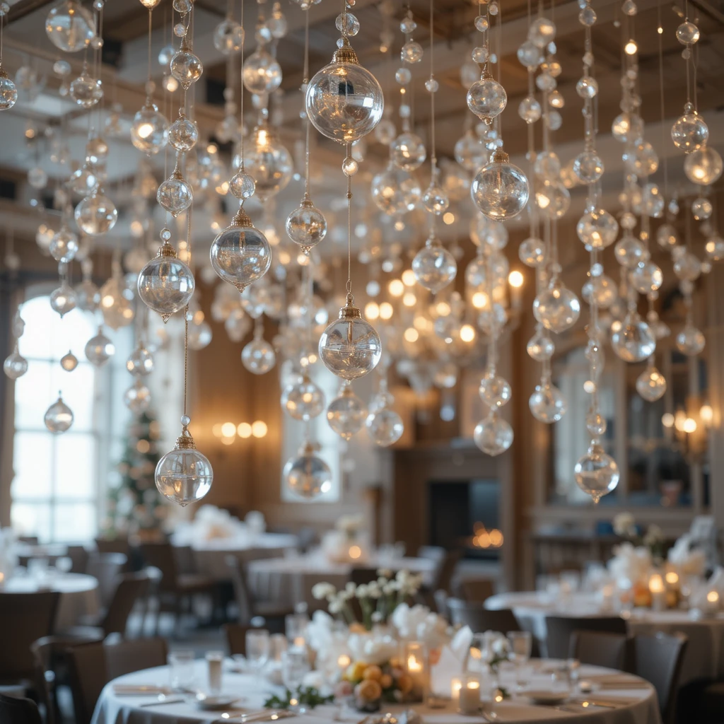 Suspend crystal ornaments or clear baubles from the ceiling. Their reflections under lights add shimmer and depth, ideal for an evening celebration.