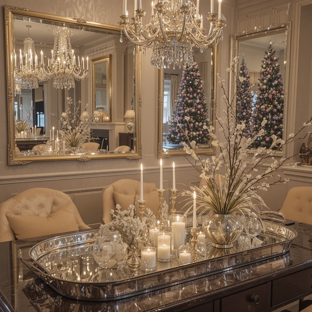 Mirrored trays or large reflective panels bounce light beautifully. When paired with candles or LED lights, they intensify the sparkle around the room.