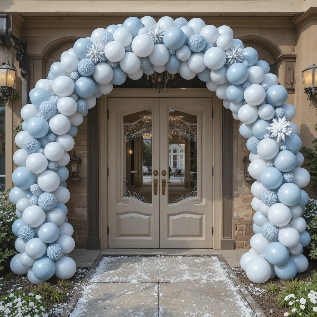 Design an entrance with a balloon arch in icy hues like silver, white, and pale blue. Add faux snow spray or glitter for a frosted effect, setting a festive tone right from the start.