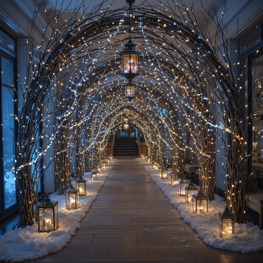 Line an entrance or hallway with faux snow, lanterns, and twig arches wrapped in fairy lights. This enchanting pathway sets the mood for the night ahead.