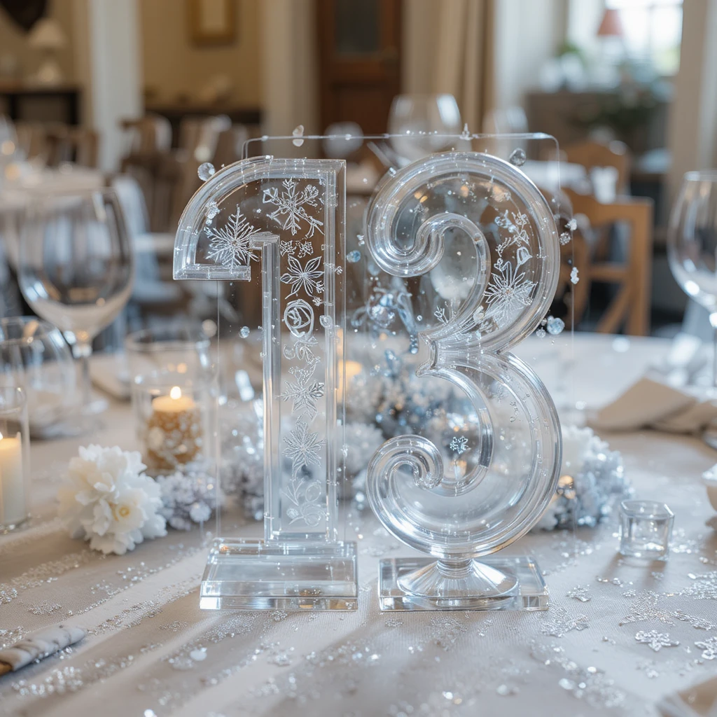Craft table numbers from clear acrylic or glass etched with frosted designs. This detail enhances the refined look of your winter homecoming decoration.