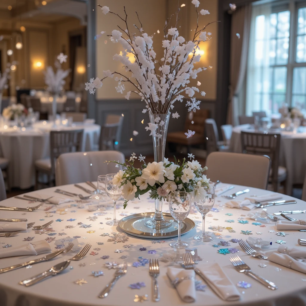 For a whimsical finish, scatter silver or iridescent snowflake confetti across tables. This subtle touch ties together the winter theme in a magical way.