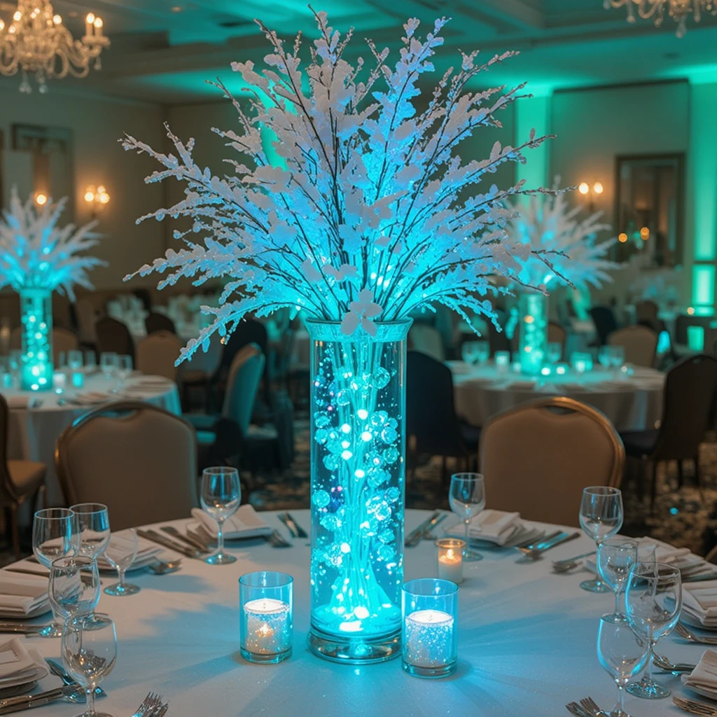 Use tall glass vases filled with crystal beads, LED lights, and frosted branches as table centerpieces. These radiate elegance and add a subtle glow to your venue.