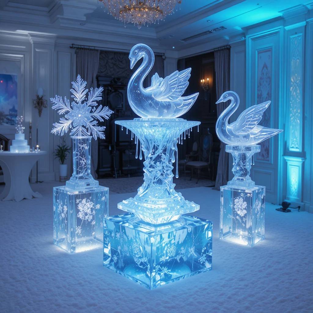 If your budget allows, an ice sculpture centerpiece is a show-stopping idea. From swans to snowflakes, the frozen artistry instantly elevates the event.