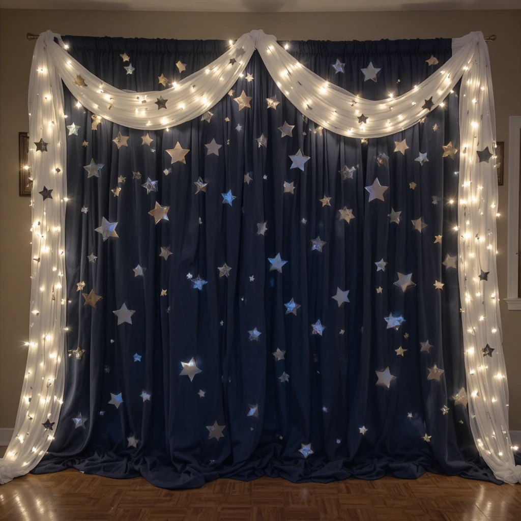 Create a starry backdrop with navy fabric, fairy lights, and metallic stars. It becomes the perfect photo booth wall and adds drama to the celebration.
