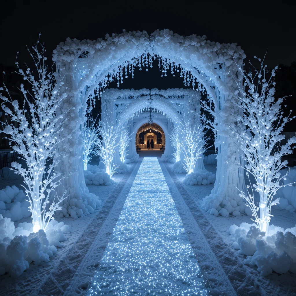 Instead of a traditional red carpet, use a white one dusted with glitter or faux snow. It makes guests feel as though they’re walking into a frosty fairytale.