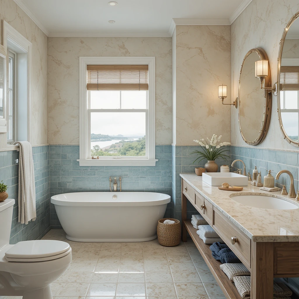 Evoke beachy bliss with sandy tones, sea-blue tiles, and driftwood accents. This light and airy aesthetic bathroom design captures the essence of the ocean right inside your home.