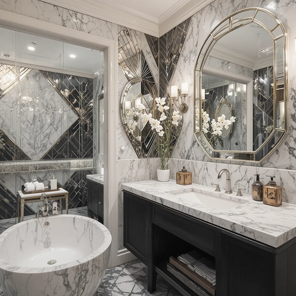 Add geometric mirrors, bold patterns, and metallic accents to channel the glamour of the 1920s. This bathroom design style merges artistry and luxury effortlessly.