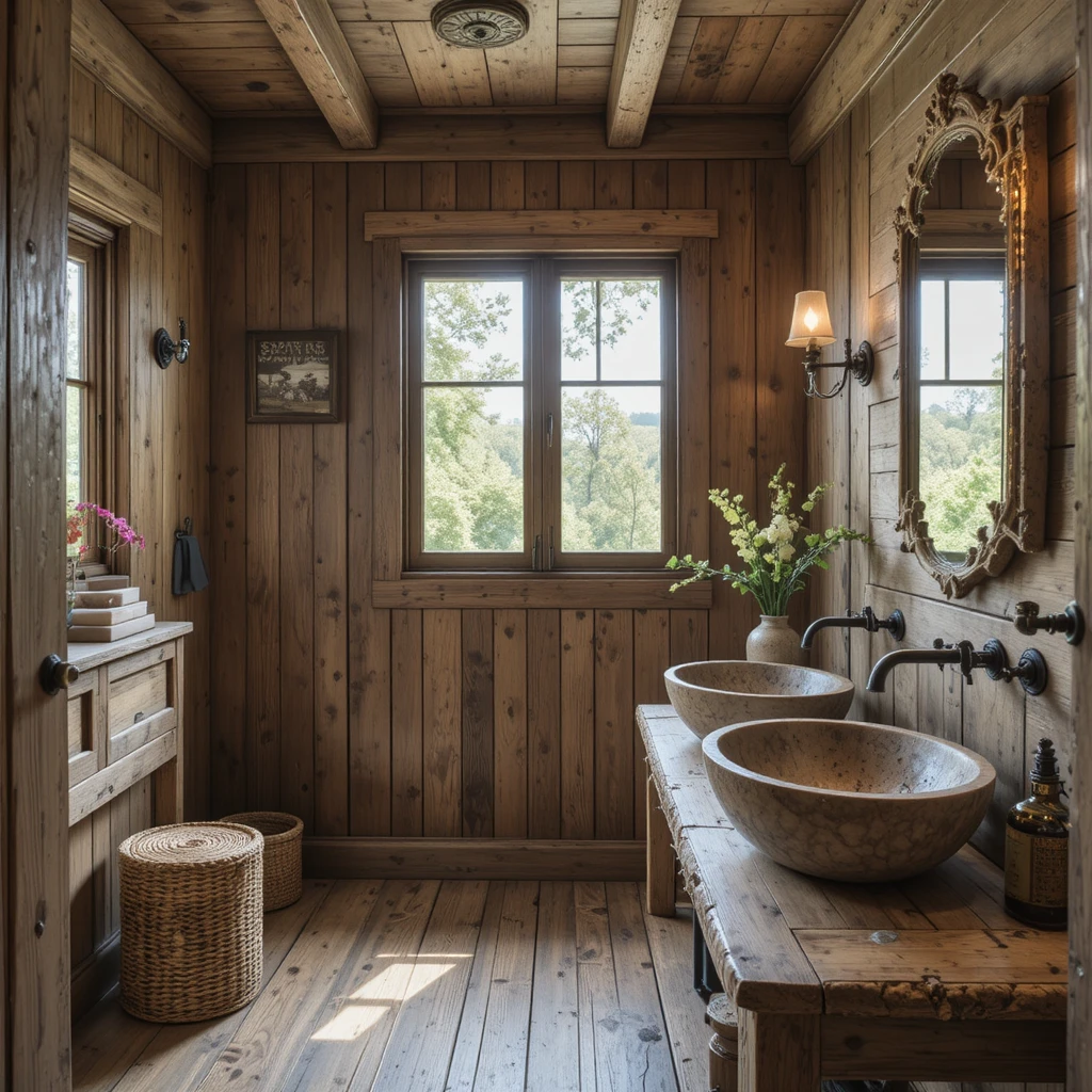 Use reclaimed wood, stone sinks, and vintage hardware to achieve a cozy rustic charm. The raw textures make the space feel warm and authentically aesthetic.