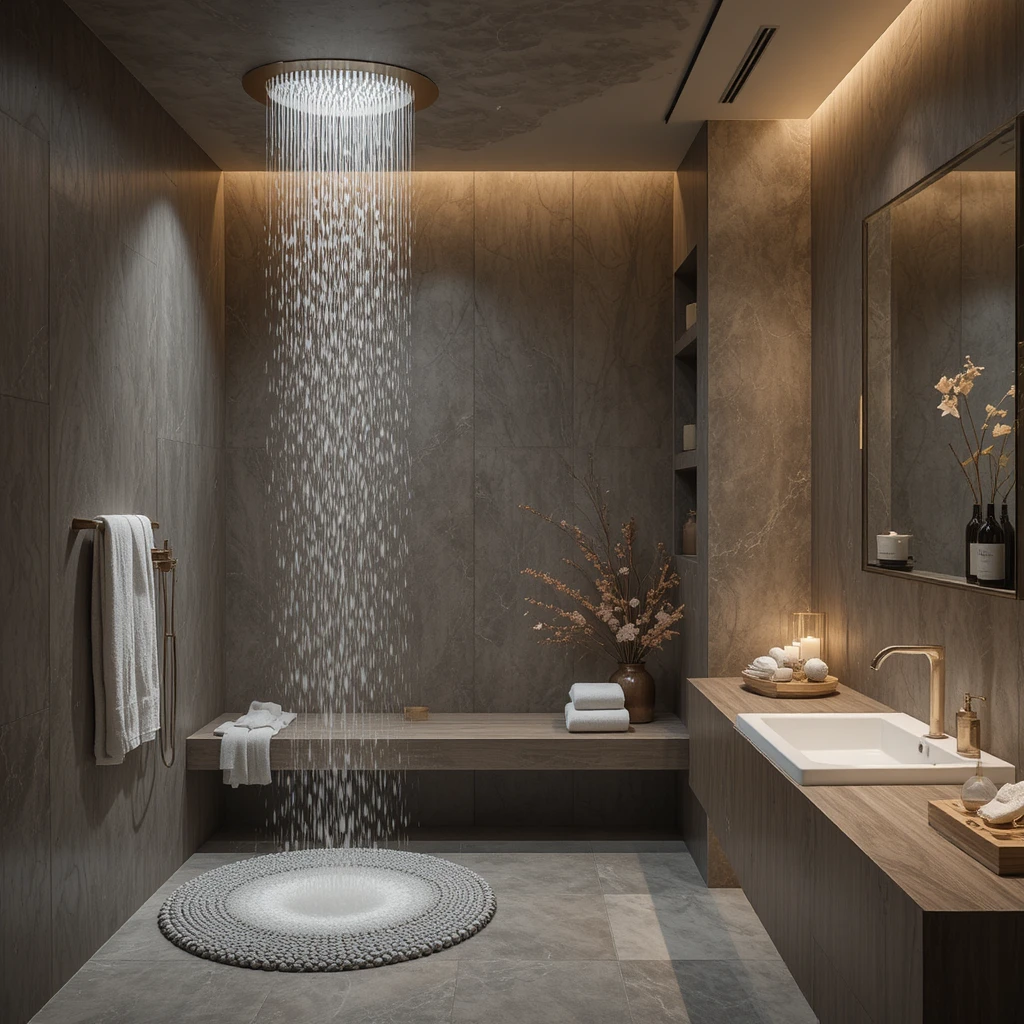 Incorporate a rainfall shower, ambient lighting, and soothing scents. This design focuses on creating a space that radiates calm and promotes self-care rituals daily.