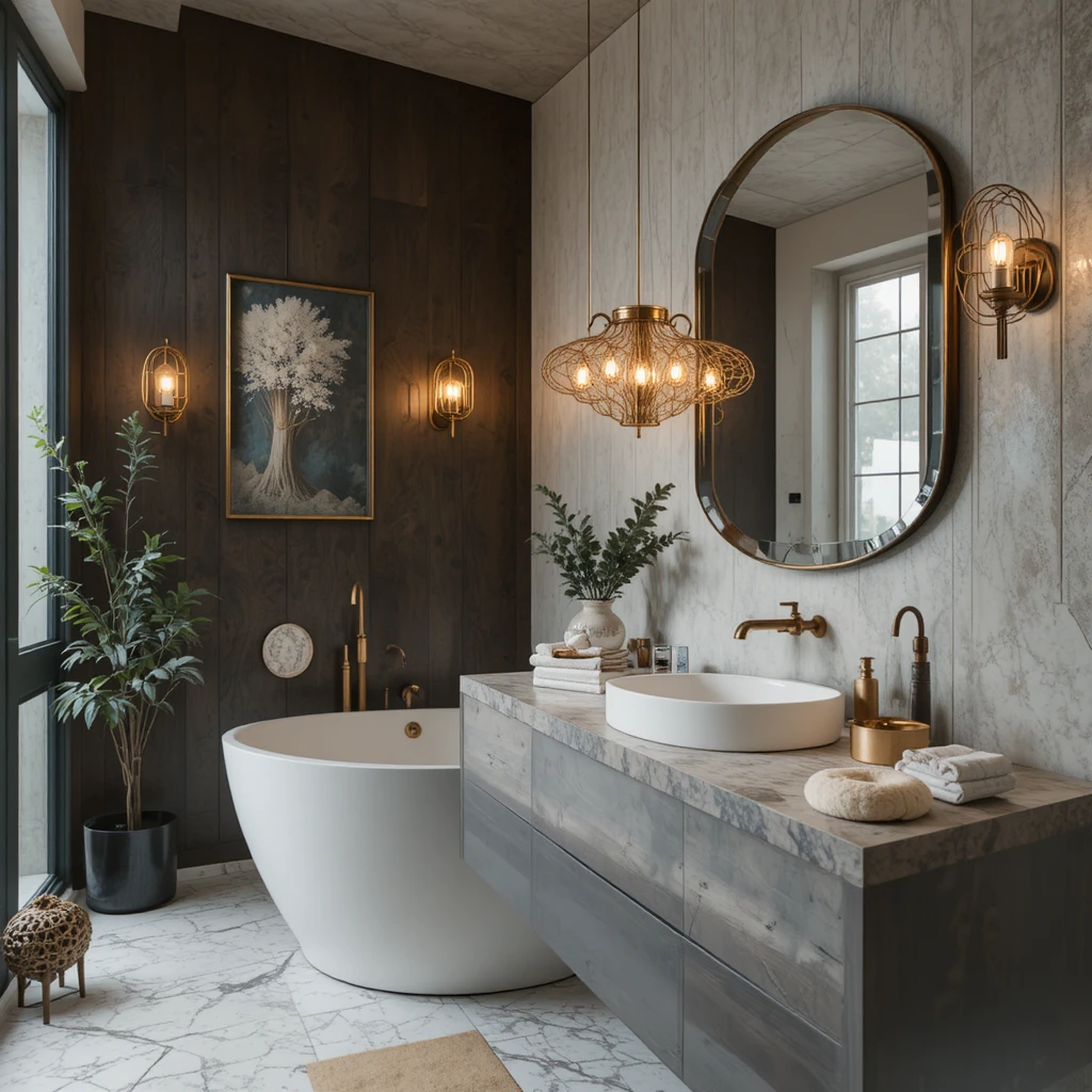Illuminate your bathroom with artistic pendant lights or wall sconces. Lighting plays a key role in highlighting your aesthetic bathroom design, enhancing both function and mood.