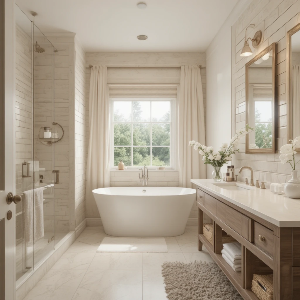 Create an airy, open feel using beige, cream, and soft taupe. The neutrality allows every element to blend seamlessly for a refined and aesthetic bathroom design.