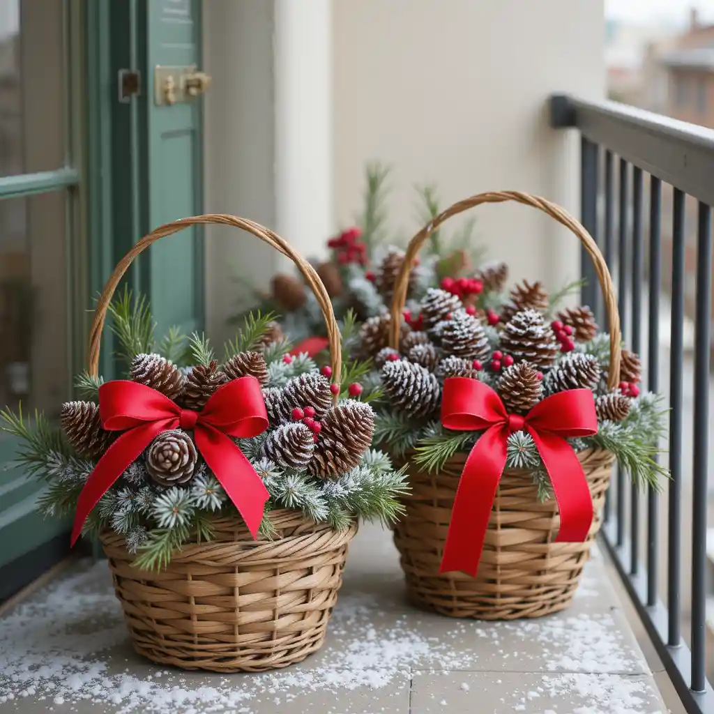 Fill woven baskets with pinecones, red ribbons, and a sprinkle of faux snow. Place them on balcony tables or corners for a rustic holiday accent.