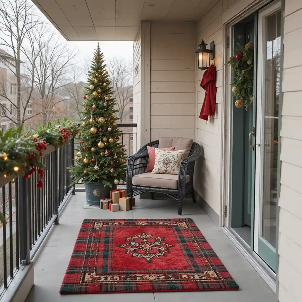 Introduce a holiday-themed outdoor rug in colors like red, green, or plaid. This simple addition grounds your decorations while giving the balcony a cozy feel.