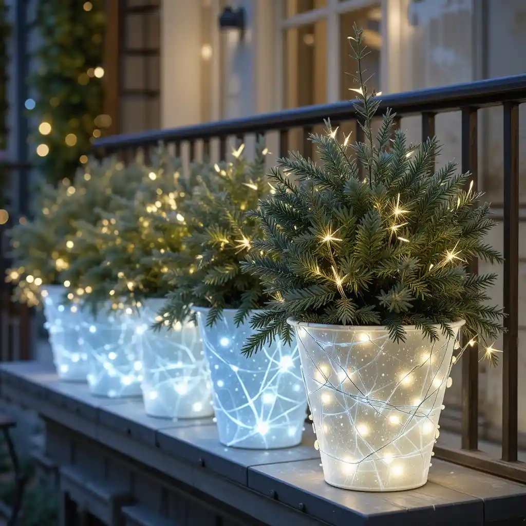 Transform ordinary planters by covering them with frosted spray and winding lights around them. This creative detail blends greenery with Christmas sparkle.