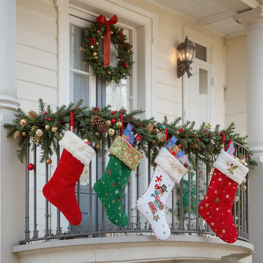 Hang cute stockings along the railing with clips or hooks. It gives your balcony a playful charm and can even be used to tuck small treats inside.