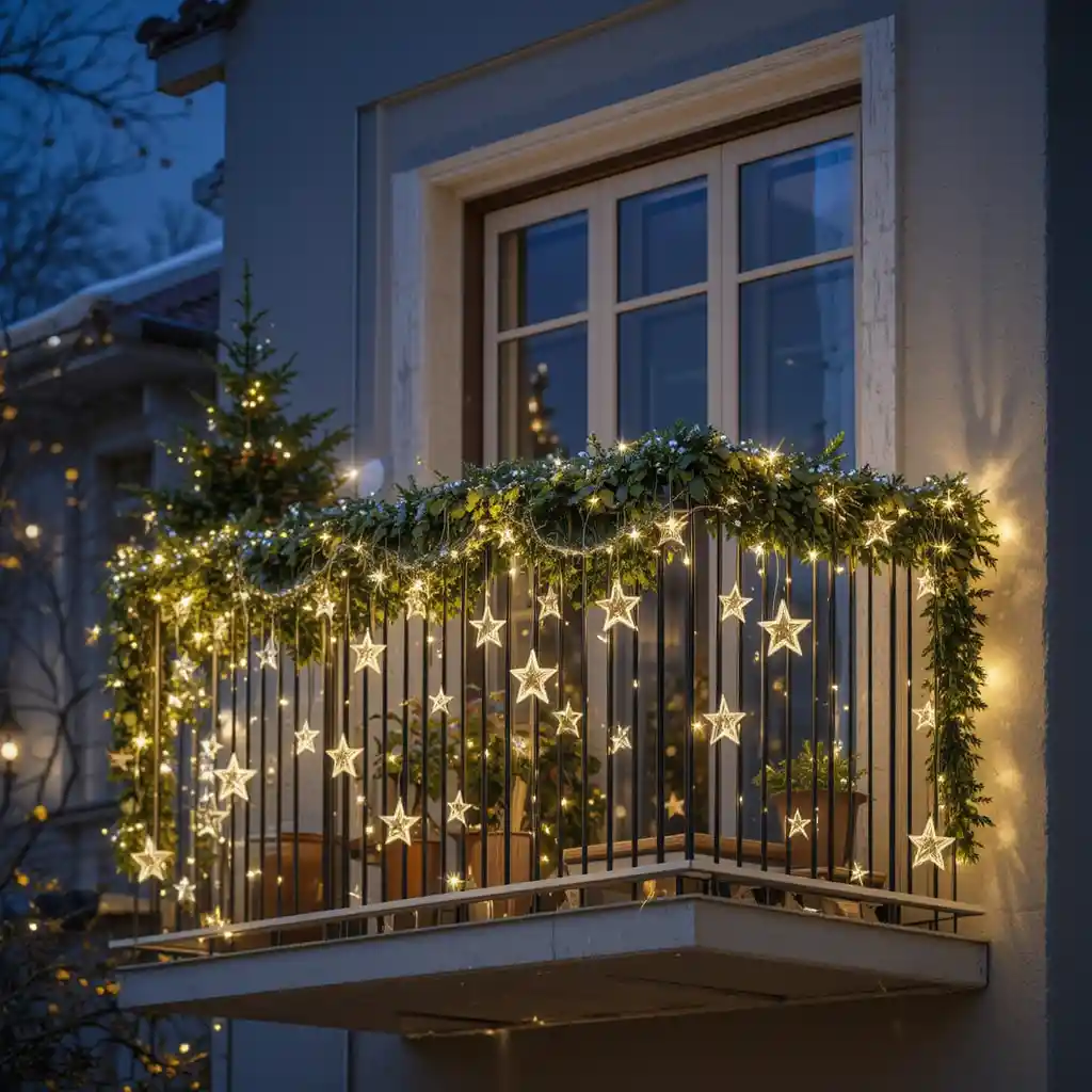 Replace ordinary fairy lights with star-shaped ones. Their sparkle creates a celestial glow that enhances the festive magic of your balcony.