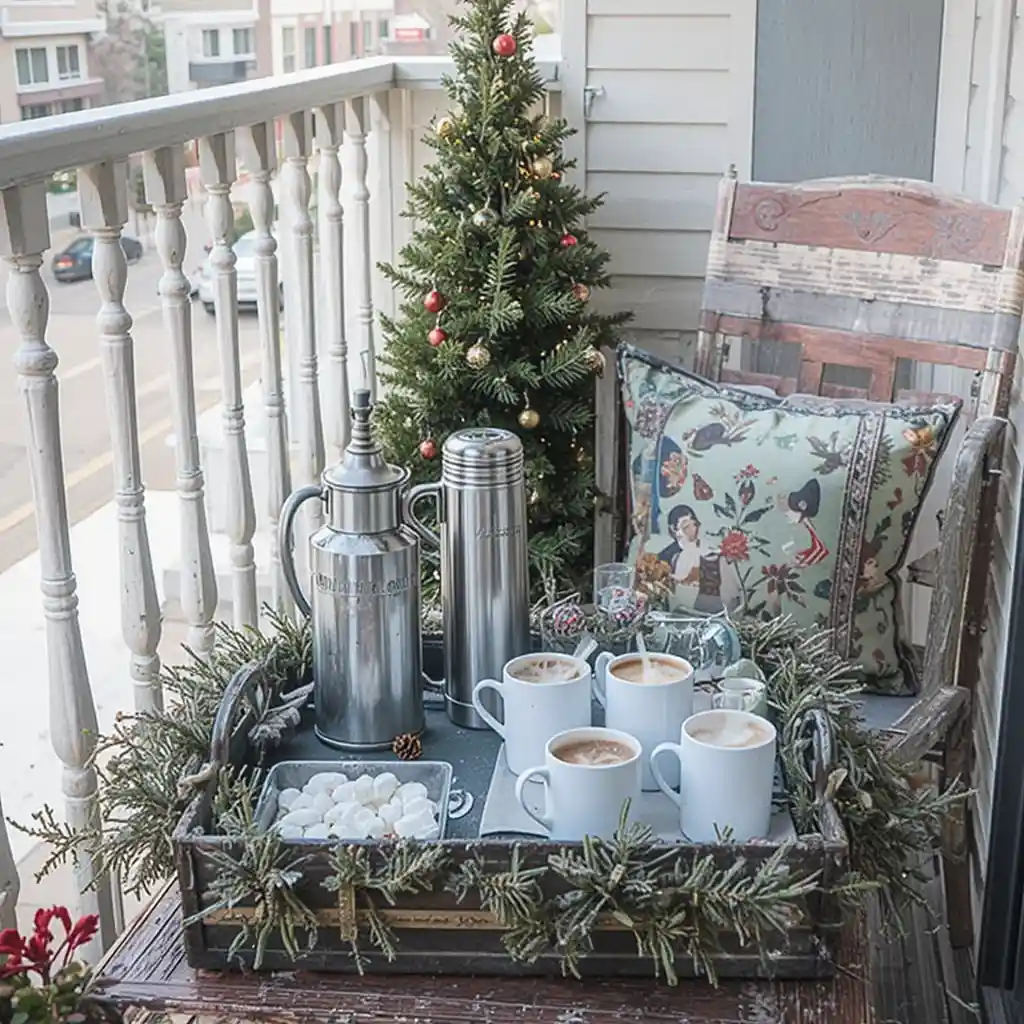 Create a small beverage nook with a tray holding mugs, a thermos, and marshmallows. This functional yet festive corner makes the balcony inviting for holiday evenings.
