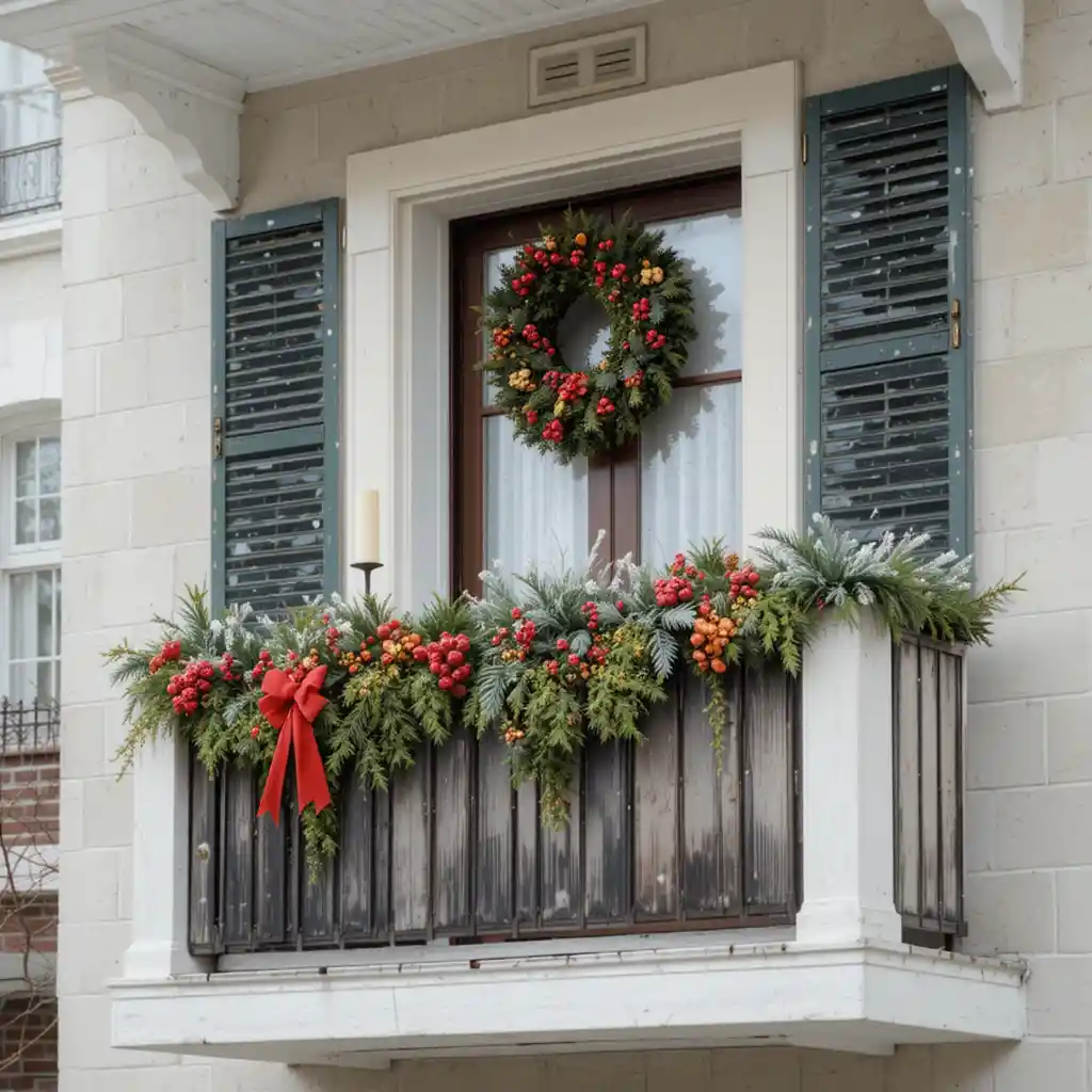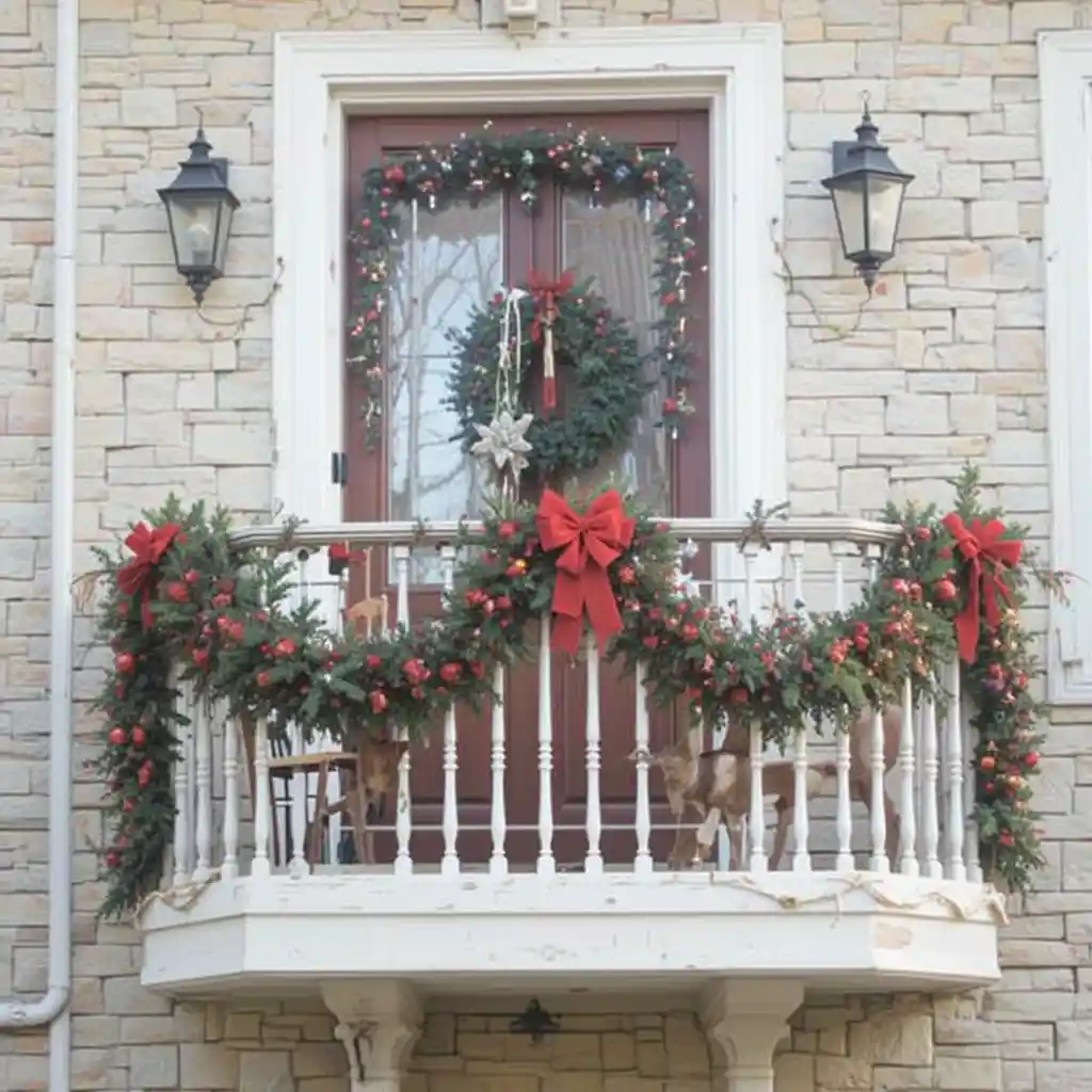Dress up your balcony railings with lush green garlands. Adding ornaments, pinecones, or ribbons along the garlands enhances the festive vibe while maintaining a classic holiday look.