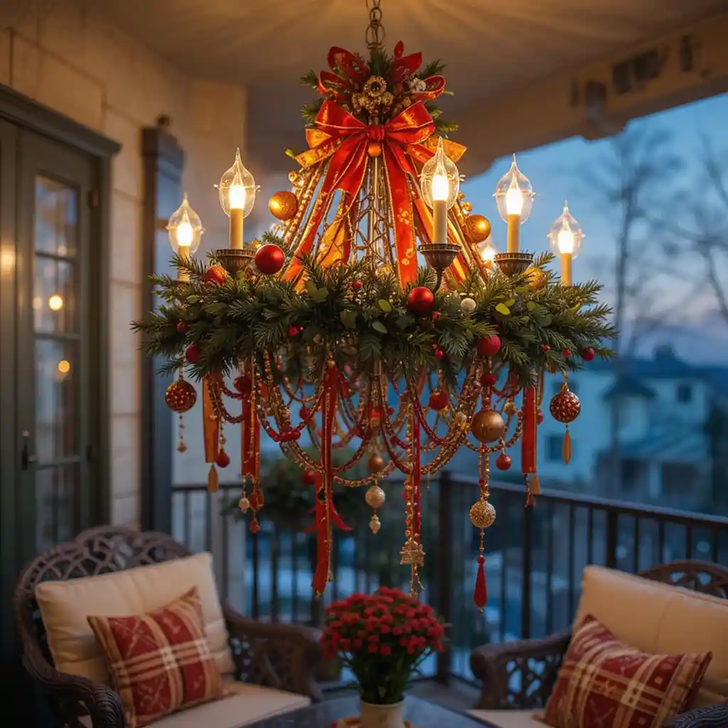 Hang a DIY chandelier decorated with ornaments, ribbons, and greenery above your seating area. This striking detail brings elegance and festive character to your balcony.