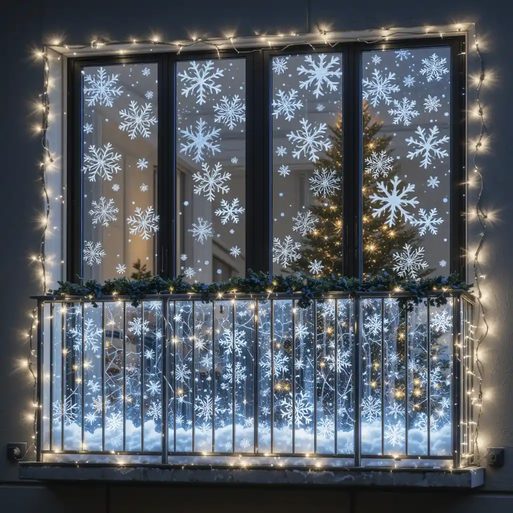 If your balcony has glass panels, stick snowflake decals for a frosty festive touch. Pair them with fairy lights around the glass for a shimmering, icy vibe.